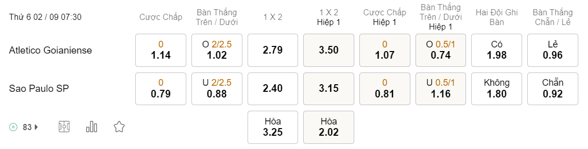 Tỉ lệ kèo Goianiense vs Sao Paulo