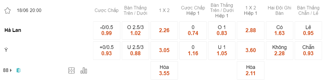 Soi kèo hiệp 1 Hà Lan vs Ý: 0.74*0*1.16