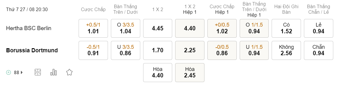 Tỉ lệ kèo Hertha Berlin vs Dortmund