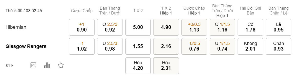 Soi kèo hiệp 1 Hibernian vs Rangers: 1.13*0/0.5*0.76