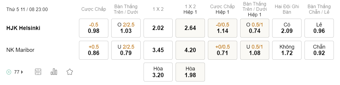Ngay trên sân khách ở trận lượt đi, HJK đã có thắng lợi trước Maribor tuy nhiên họ cũng chỉ kết thúc trận đấu với 2 bàn thắng. Theo thống kê, 2 trận gần nhất của cả HJK và Maribor đều chỉ kết thúc với nhiều nhất 2 bàn thắng được ghi. Vì vậy khả năng cao đây sẽ là một trận đấu không có nhiều pha lập công và các chuyên gia của Vebo TV nhận định tỉ lệ nổ Xỉu sẽ là cao hơn.