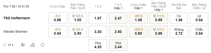 Soi kèo hiệp 1 Hoffenheim vs Bremen: 1.08*0/0.5*0.80