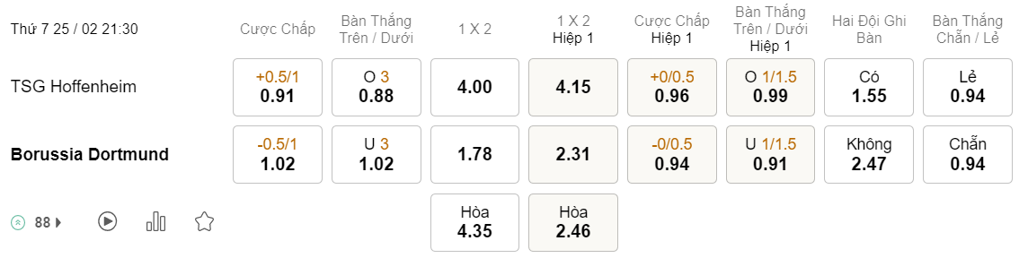 Tỉ lệ kèo Hoffenheim vs Dortmund