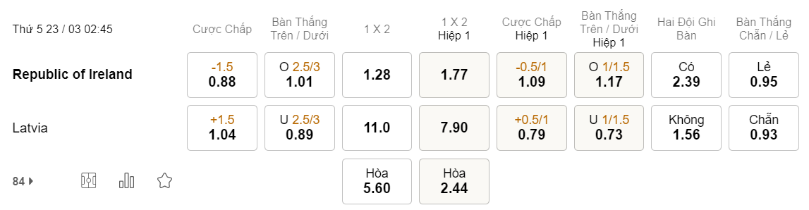 Soi kèo châu Á Ireland vs Latvia: 0.88*1.5*1.04