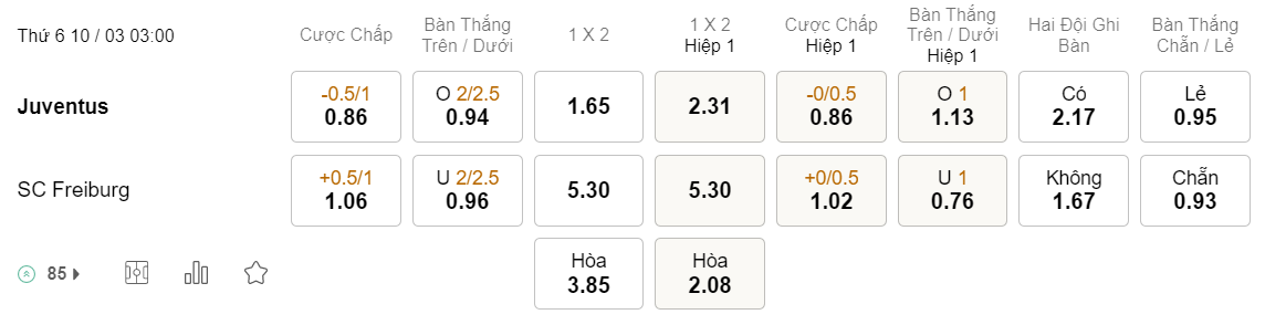 Soi kèo hiệp 1 Juventus vs Freiburg: 0.86*0/0.5*1.02