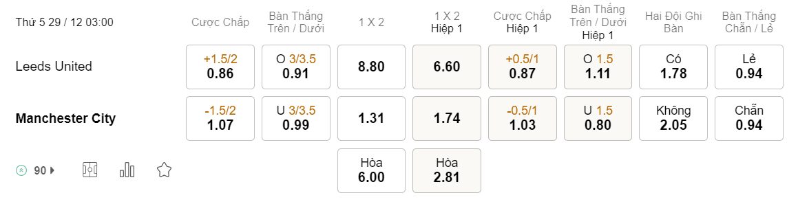 Soi kèo hiệp 1 Leeds vs Man City: 0.87*0.5/1*1.03