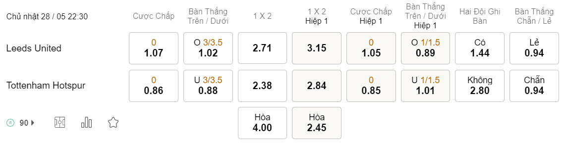 Tỉ lệ kèo Leeds vs Tottenham