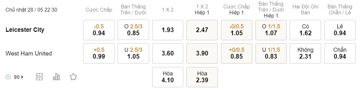 Soi kèo châu Á Leicester vs West Ham: 0.94*0.5*0.99