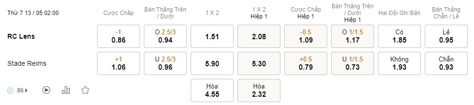 Soi kèo châu Á Lens vs Reims: 0.86*1*1.06