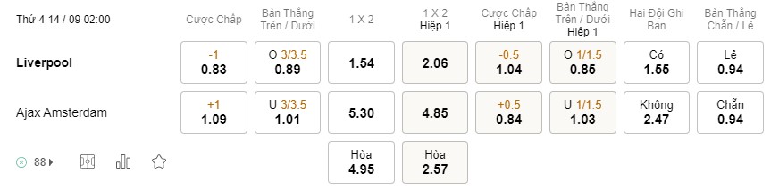 Tỉ lệ kèo Liverpool vs Ajax