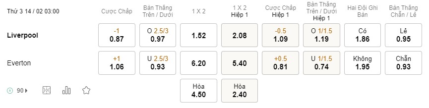 Tỉ lệ kèo Liverpool vs Everton