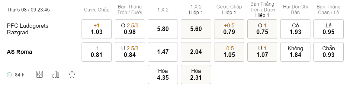 Tỉ lệ kèo Ludogorets vs Roma