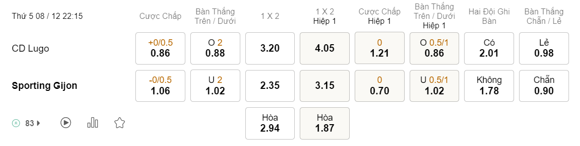 Trong khi đó, Lugo lại có phong độ ngược lại với chỉ duy nhất 1 thắng lợi trong 5 lần ra sân gần nhất, còn lại là 2 trận hòa và 2 thất bại. Vì vậy, các chuyên gia nhận định, Gijon sẽ là lựa chọn an toàn hơn ở thời điểm này.