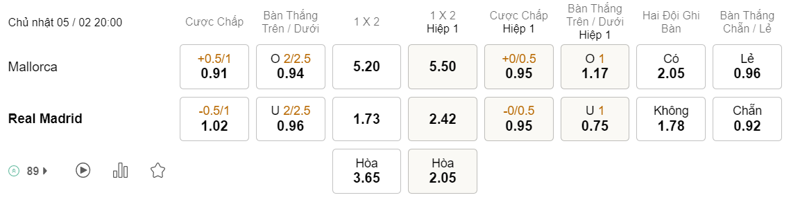 Tỉ lệ kèo Mallorca vs Real Madrid