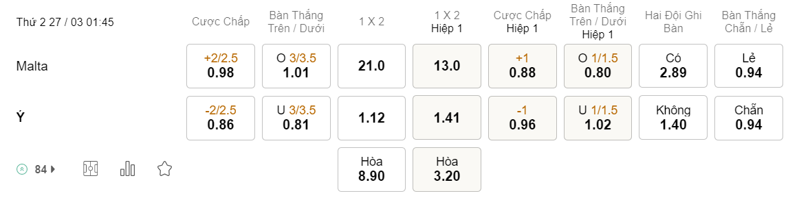 Soi kèo châu Á Malta vs Ý: 0.98*2/2.5*0.86
