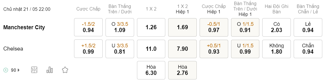 Soi kèo châu Á Man City vs Chelsea: 0.94*1.5/2*0.99