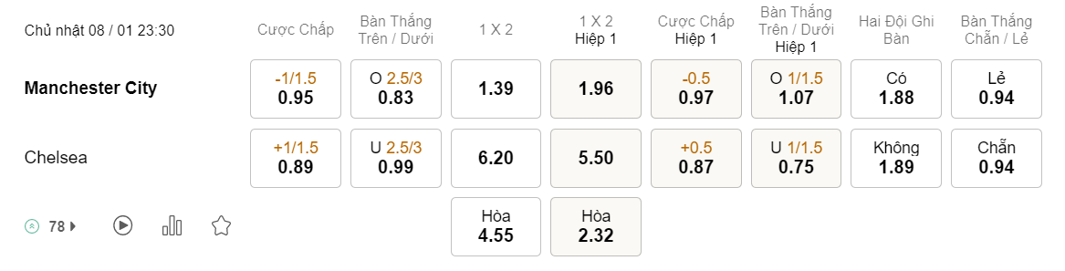 Soi kèo châu Á Man City vs Chelsea: 0.95*1/1.5*0.89