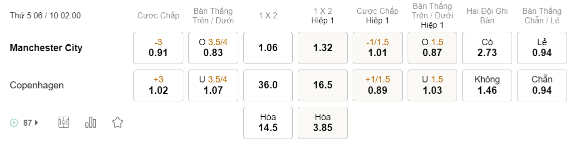 Soi kèo châu Á Man City vs Copenhagen: 0.91*3*1.02