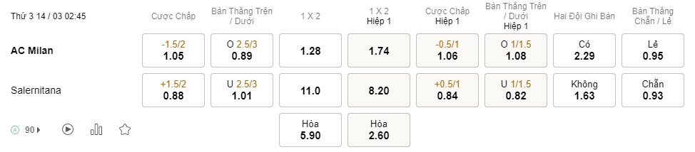 Soi kèo hiệp 1 Milan vs Salernitana: 1.06*0.5/1*0.84