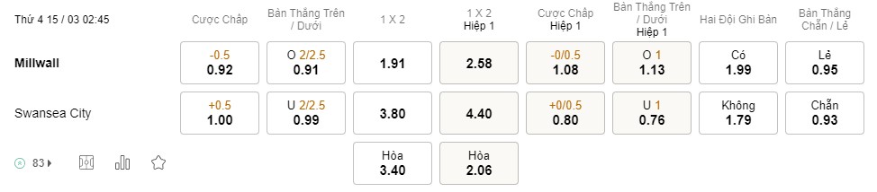 Soi kèo hiệp 1 Millwall vs Swansea: 1.08*0/0.5*0.80