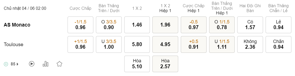 Soi kèo châu Á Monaco vs Toulouse: 0.96*1/1.5*0.96