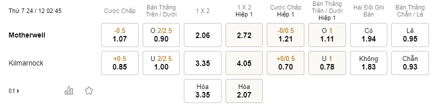 Soi kèo châu Á Motherwell vs Kilmarnock: 1.07*0.5*0.85
