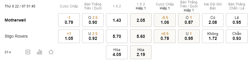 Soi kèo châu Á Motherwell vs Sligo Rovers: 0.79*1*1.05