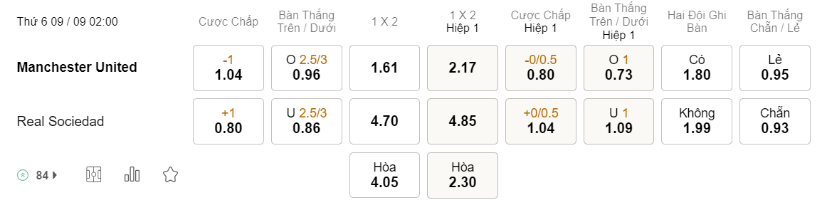 Soi kèo hiệp 1 MU vs Sociedad: 0.80*0/0.5*1.04