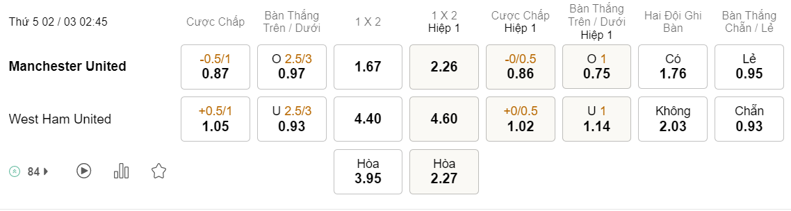 Tỉ lệ kèo MU vs West Ham