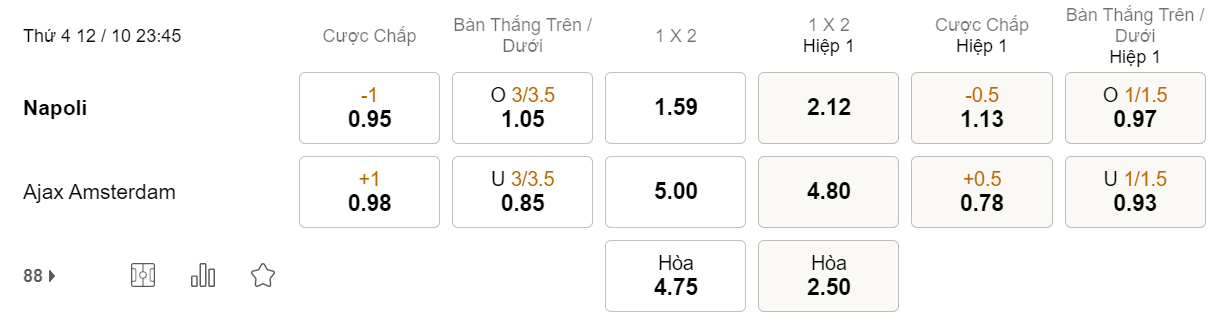 Tỉ lệ kèo Napoli vs Ajax