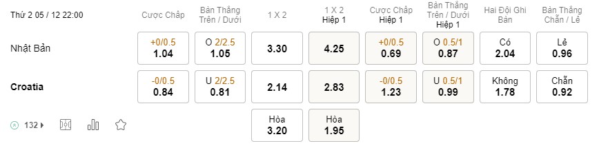 Soi kèo hiệp 1 Nhật Bản vs Croatia: 0.69*0/0.5*1.23