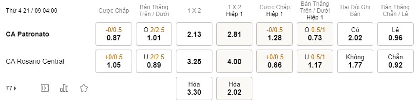 Tỉ lệ kèo Patronato vs Rosario Central