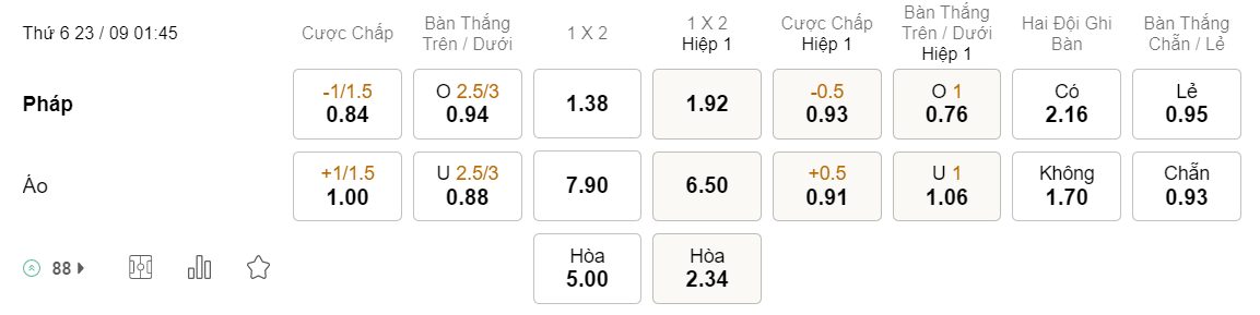 Soi kèo châu Á Pháp vs Áo: 0.84*1/1.5*1.00