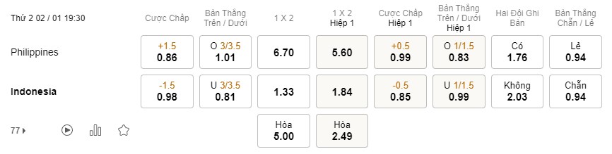 Soi kèo tài xỉu Philippines vs Indonesia: 1.01*3/3.5*0.81