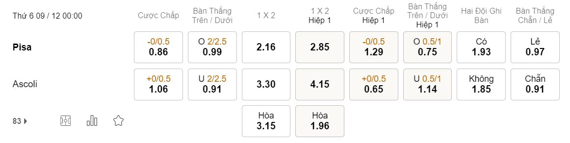 Soi kèo hiệp 1 Pisa vs Ascoli: 1.29*0/0.5*0.65