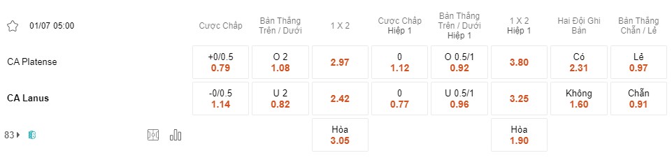 Soi kèo tài xỉu Platense vs Lanus: 1.08*2*0.82