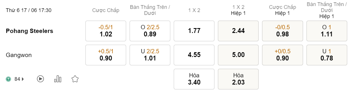 Soi kèo châu Á Pohang Steelers vs Gangwon FC: 1.02*0.5/1*0.90