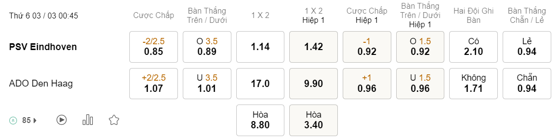 Soi kèo châu Á PSV vs Den Haag: 0.85*2/2.5*1.07