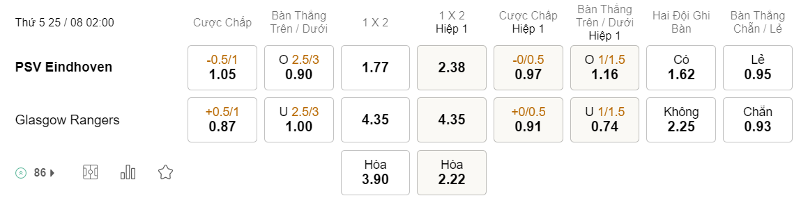Soi kèo hiệp 1 PSV vs Rangers: 0.97*0/0.5*0.91