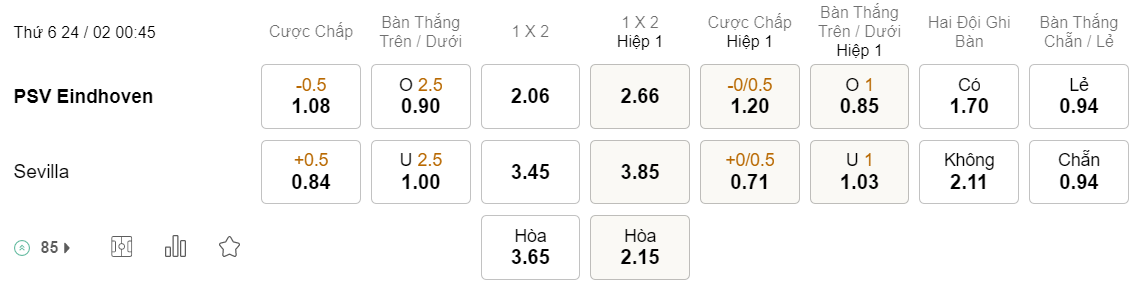 Soi kèo hiệp 1 PSV vs Sevilla: 1.20*0/0.5*0.71