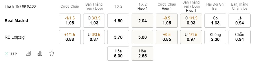 Soi kèo hiệp 1 Real Madrid vs Leipzig: 1.05*0.5*0.85