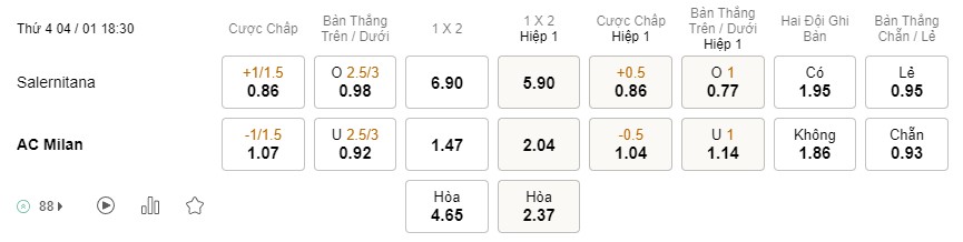 Soi kèo hiệp 1 Salernitana vs Milan: 0.86*0.5*1.04
