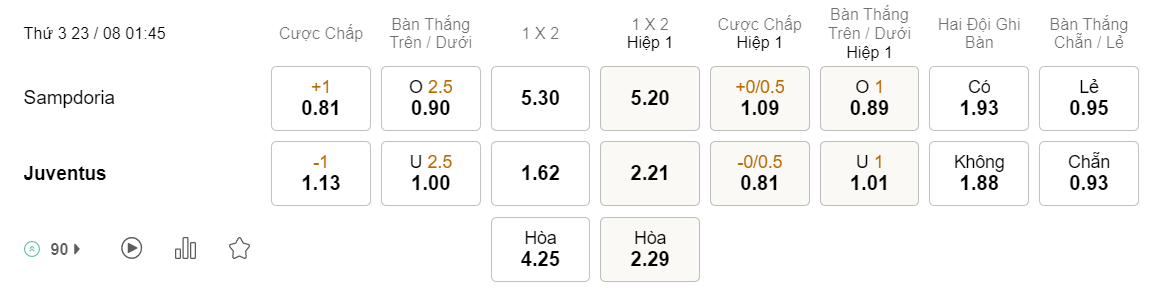 Soi kèo châu Á Sampdoria vs Juventus: 0.81*1*1.13