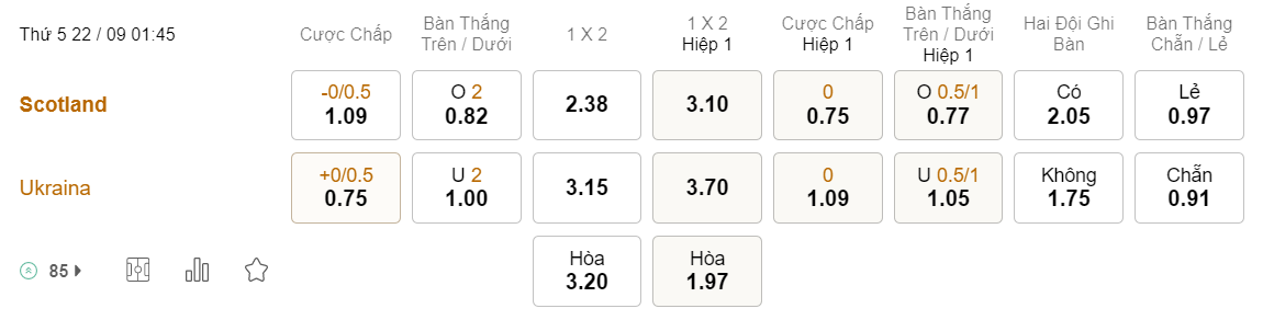 Soi kèo hiệp 1 Scotland vs Ukraina: 0.75*0*1.09