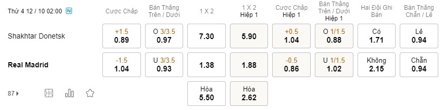 Tỉ lệ kèo Shakhtar Donetsk vs Real Madrid