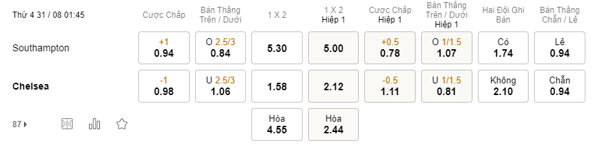 Soi kèo tài xỉu Southampton vs Chelsea: 0.84*2.5/3*1.06