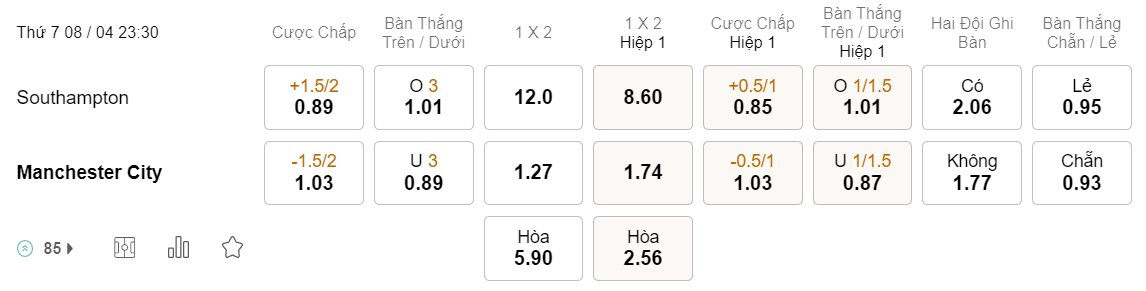 Soi kèo hiệp 1 Southampton vs Man City: 0.85*0.5/1*1.03