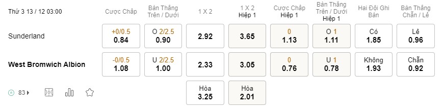 Soi kèo hiệp 1 Sunderland vs West Brom: 1.13*0*0.76