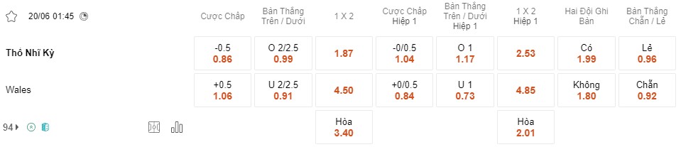 Tỉ lệ kèo Thổ Nhĩ Kỳ vs Wales