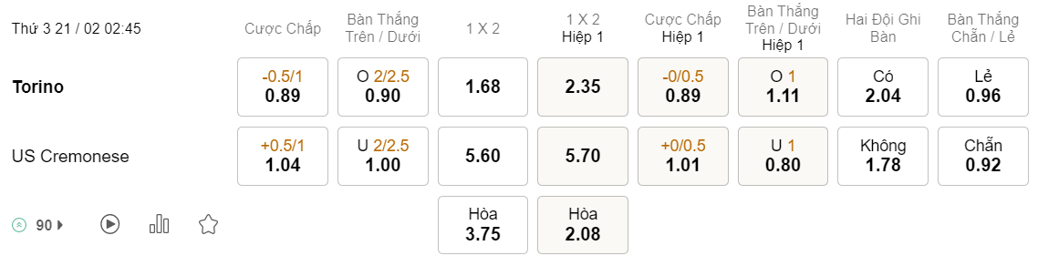 Soi kèo hiệp 1 Torino vs Cremonese: 0.89*0/0.5*1.01